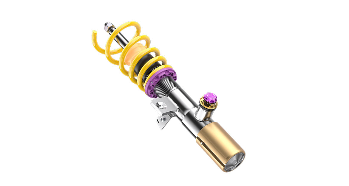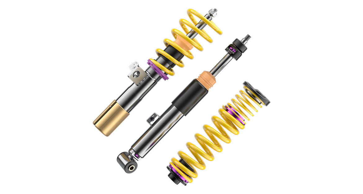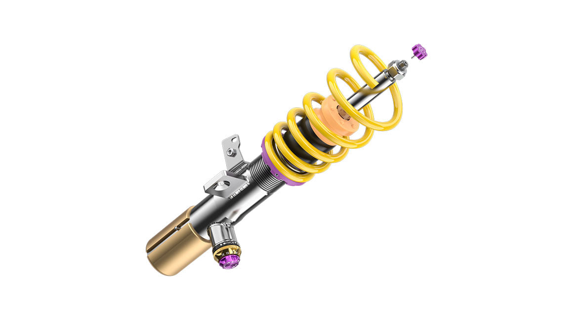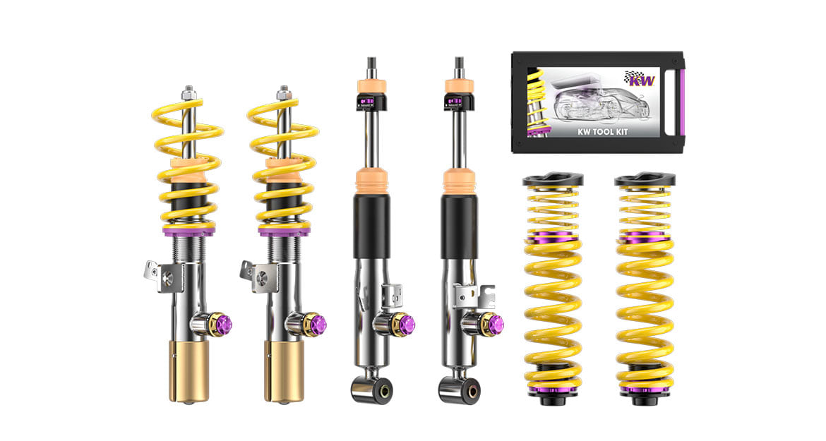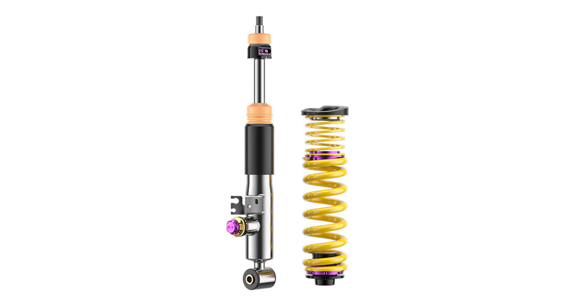At KW, we offer our KW V3 and KW V4 coilover kits for the BMW M3 (G81). Both coilover kits enable a continuous lowering and offer more comfortable and sporty driving. However, both coilovers differ in their construction: Besides the lowering option of 20 to 25 millimeters at the front axle and 15 to 30 millimeters at the rear axle, the lowspeed compression and rebound of the KW V3 are separately adjustable. The KW V4 enables a slightly more specific damper adjustment: It can be adapted in highspeed compression. The result: More direct feedback when steering and less body roll in curves.